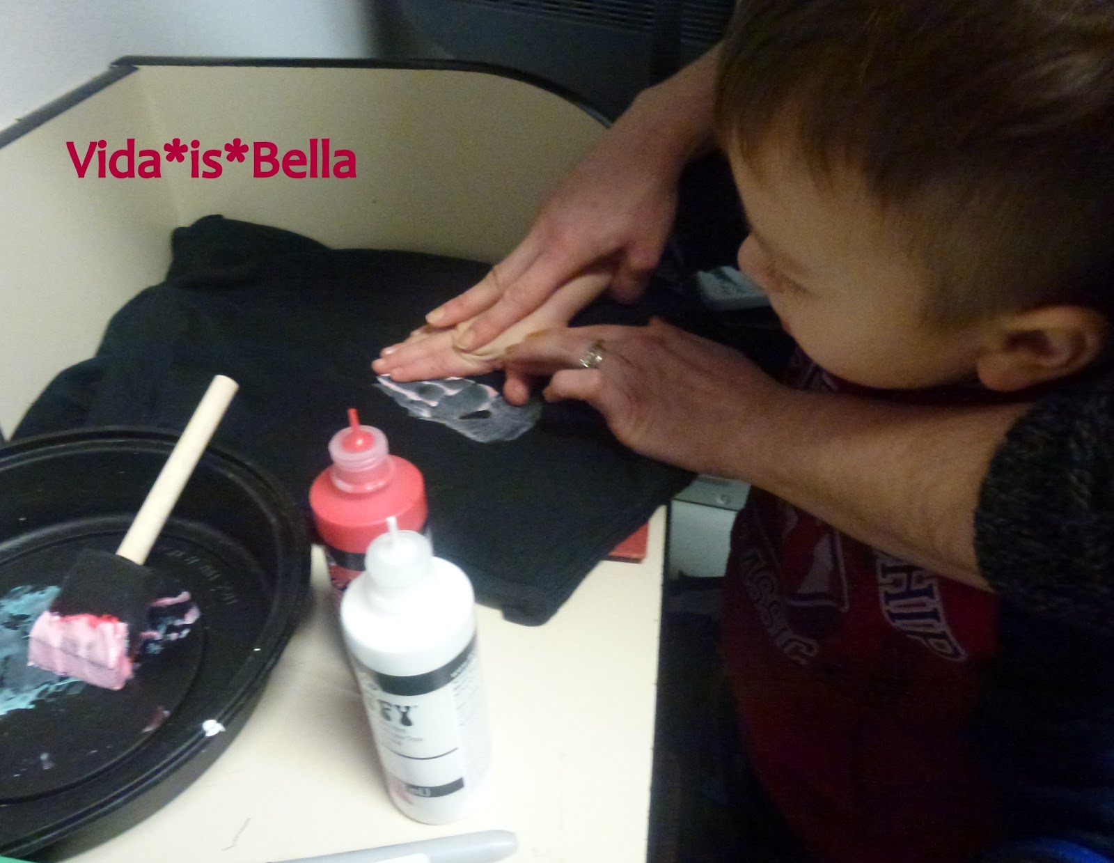 Luego, con un poco de ayuda pusieron sus manos en la playera. Recordatorio: Pon un poco de periodico o carton dentro de la playera, asi la pintura no pase al otro lado.